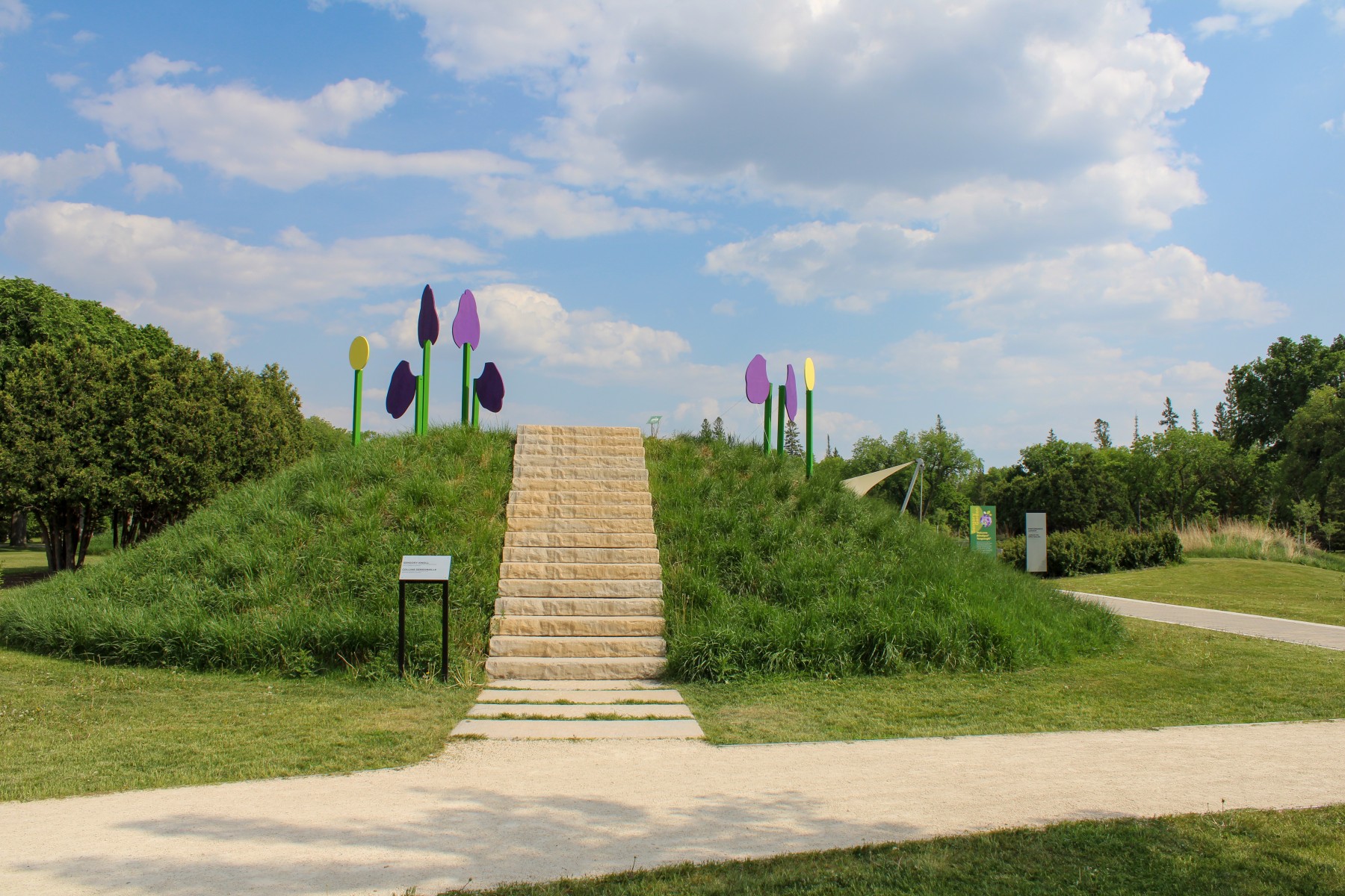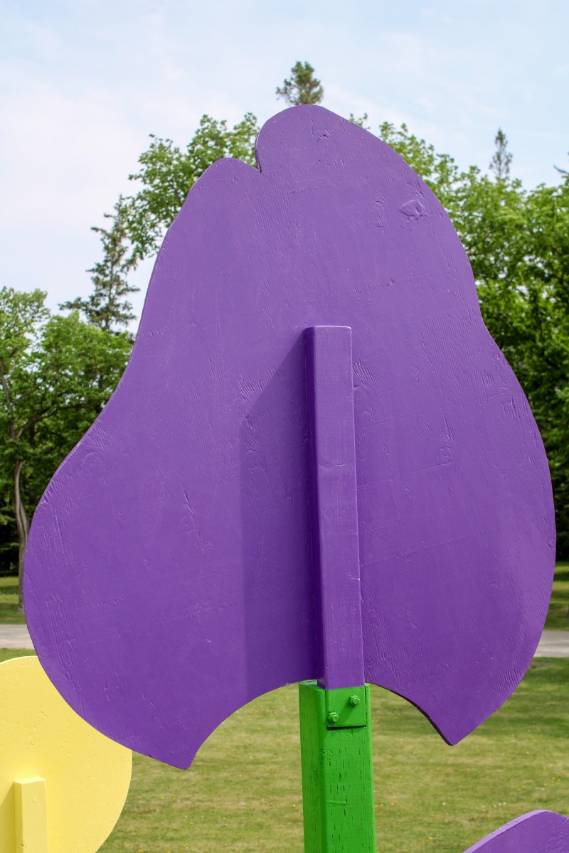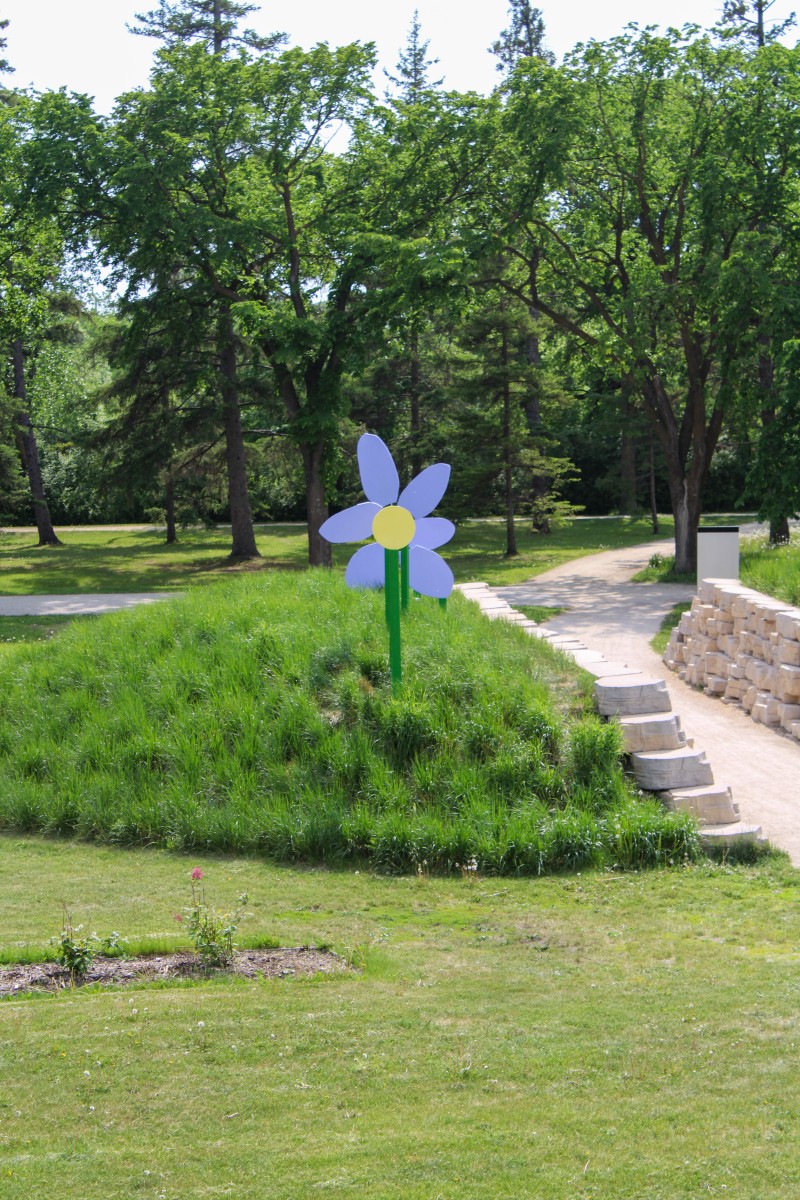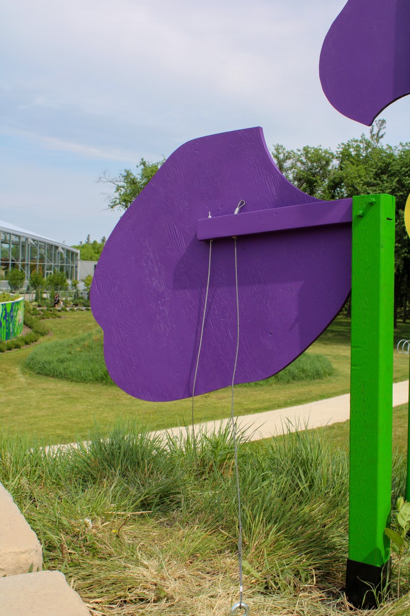 Petals in Perspective invites viewers to move around the gardens and wander on the knolls, and, in so doing, to discover flower pieces that appear whole when viewed from a particular position. The installation highlights two plant species native to Manitoba, the Prairie Crocus, Manitoba’s provincial flower, and the endangered Western Spiderwort. In the shadow of The Leaf and the presence of the Sensory Gardens, these structures stand tall, emphasizing the importance of these plant species. Petals in Perspective prompts viewers to question their decisions concerning habitat loss, while offering a playful way to create awareness about these flowers, the Spiderwort’s endangerment, and plant life cycles more broadly.